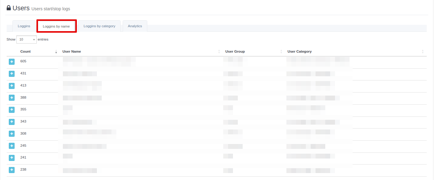 Aquí se mostrarán los inicios de sesión agrupados por nombre de usuario. Si en tu plataforma hay muchos usuarios, puede afectar al tiempo de carga de la página, igual que el rango de tiempo que selecciones.