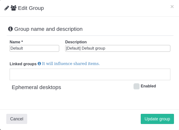 - Cambiar el grupo principal del usuario comportará la parada de todos sus escritorios virtuales y el vaciado de la papelera de reciclaje. Además, podría tener problemas con los permisos del nuevo grupo. Para consultar más información, leer: Migrar usuarios de grupo principal