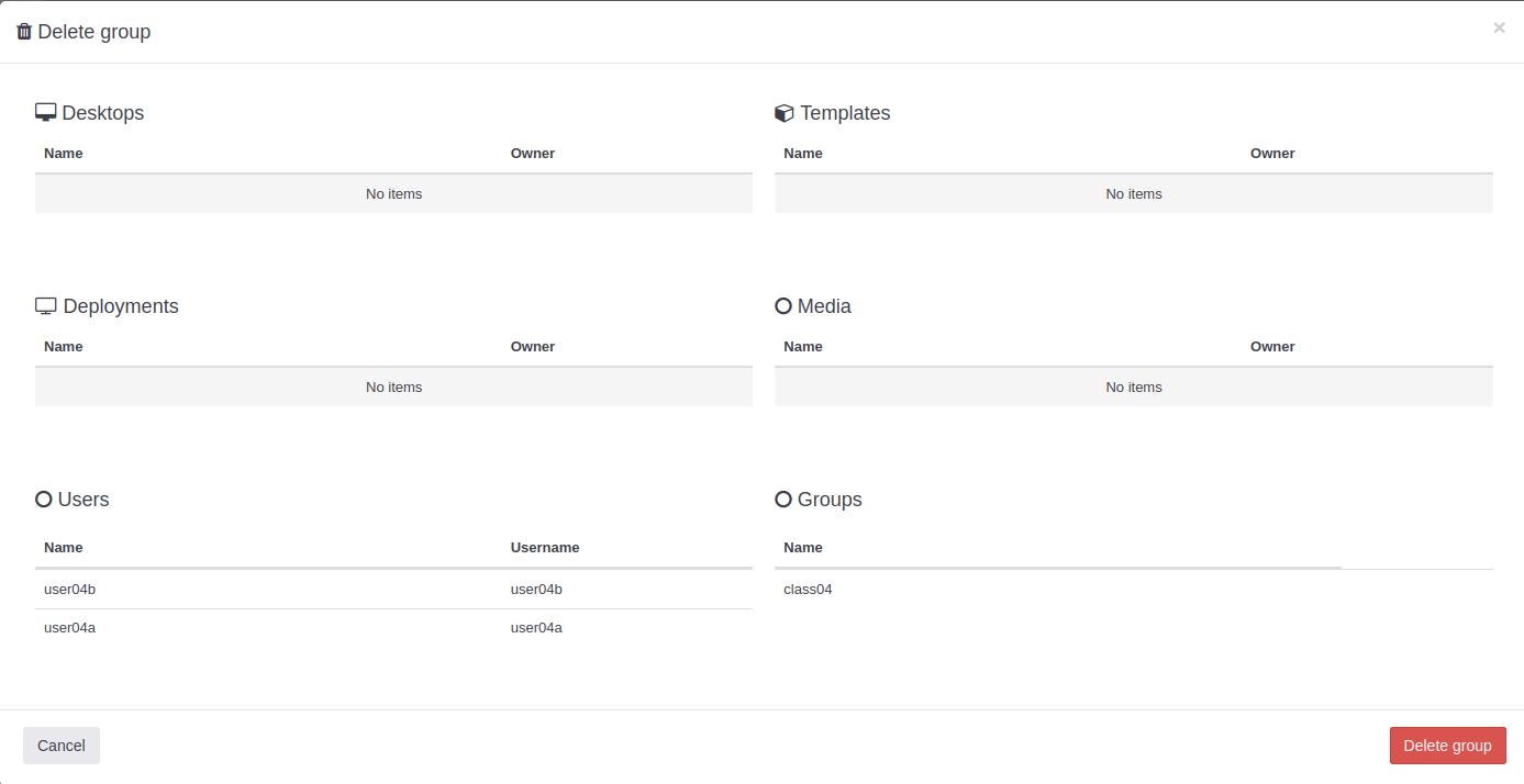 : Esta opción permite vaciar un grupo borrando todos los usuarios del grupo pero manteniendo el grupo existente. Cuando se pulsa, sale esta ventana con información de cuántos elementos de cada tipo se borrarán.