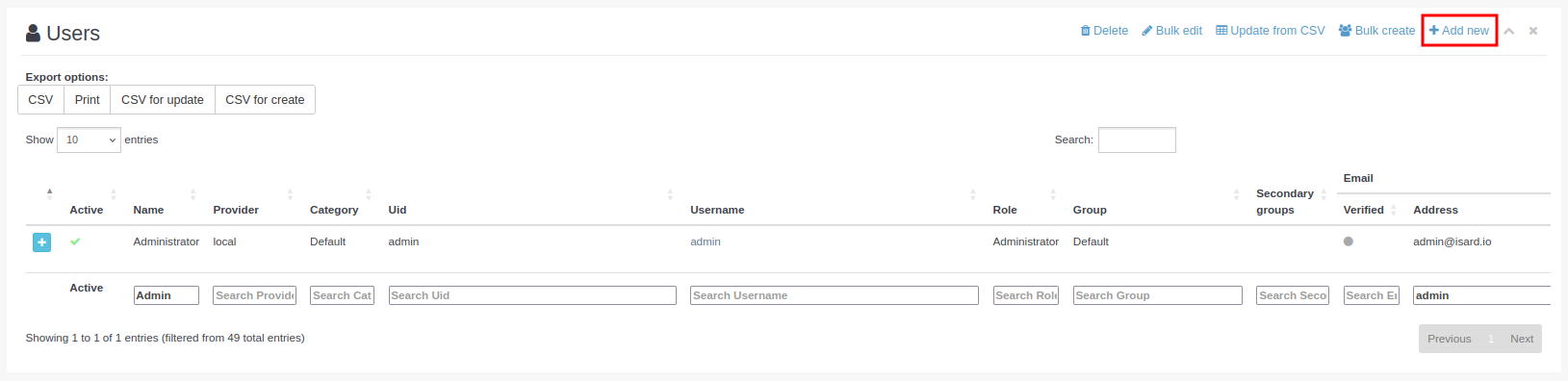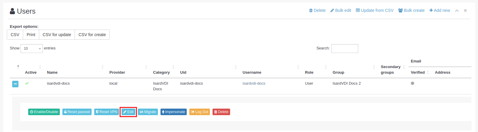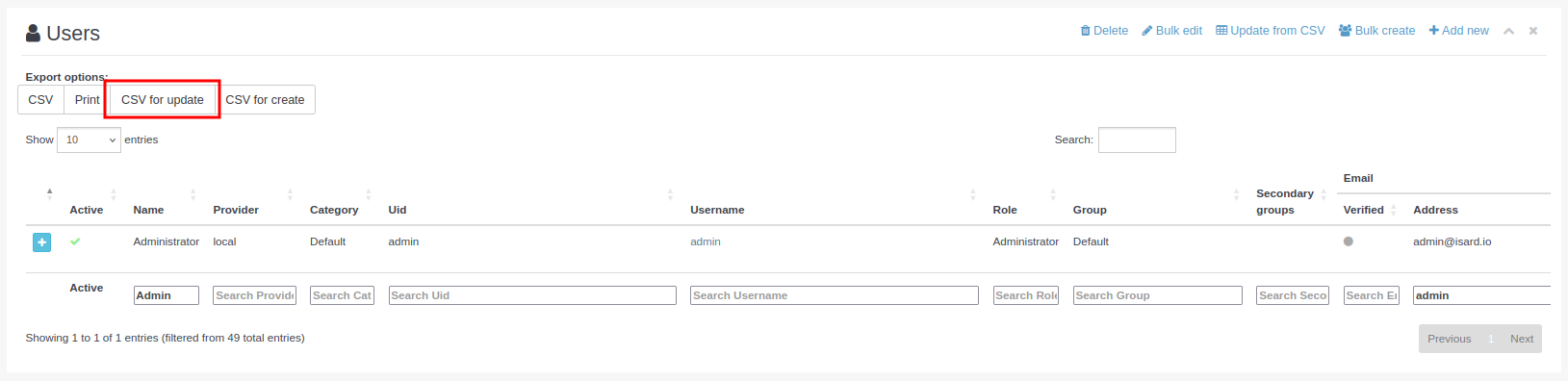 Si en lugar de crear nuevos usuarios se quiere actualizar la información de usuarios existentes, hay que utilizar el botón CSV for update, explicado en el apartado de edición de usuarios: Actualización de usuarios.