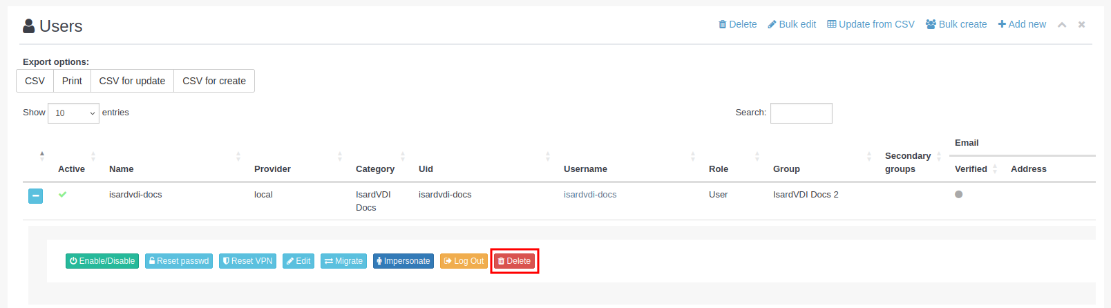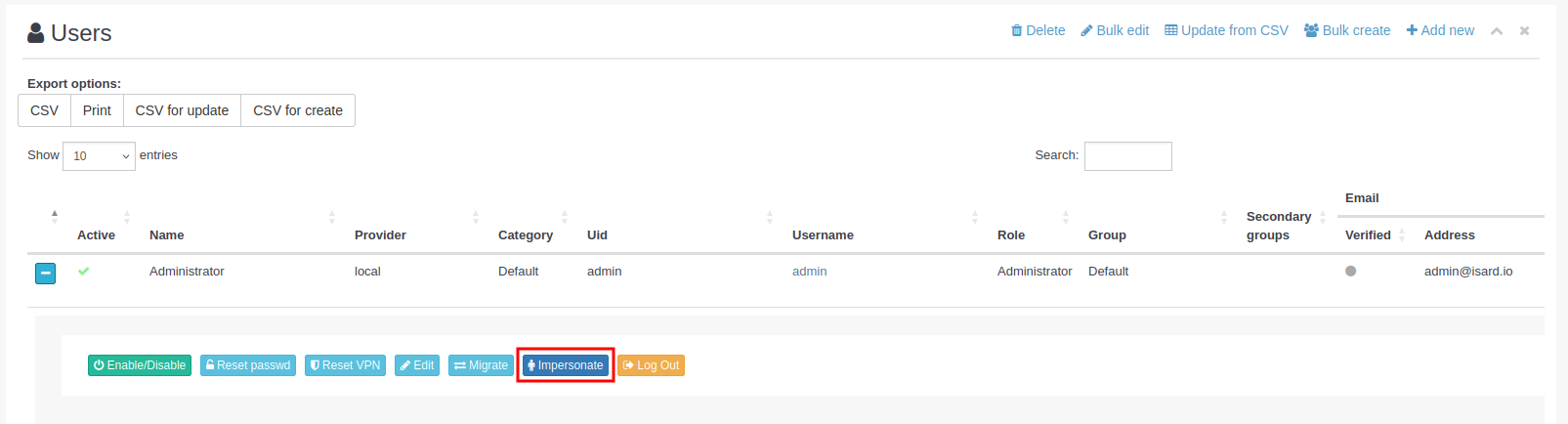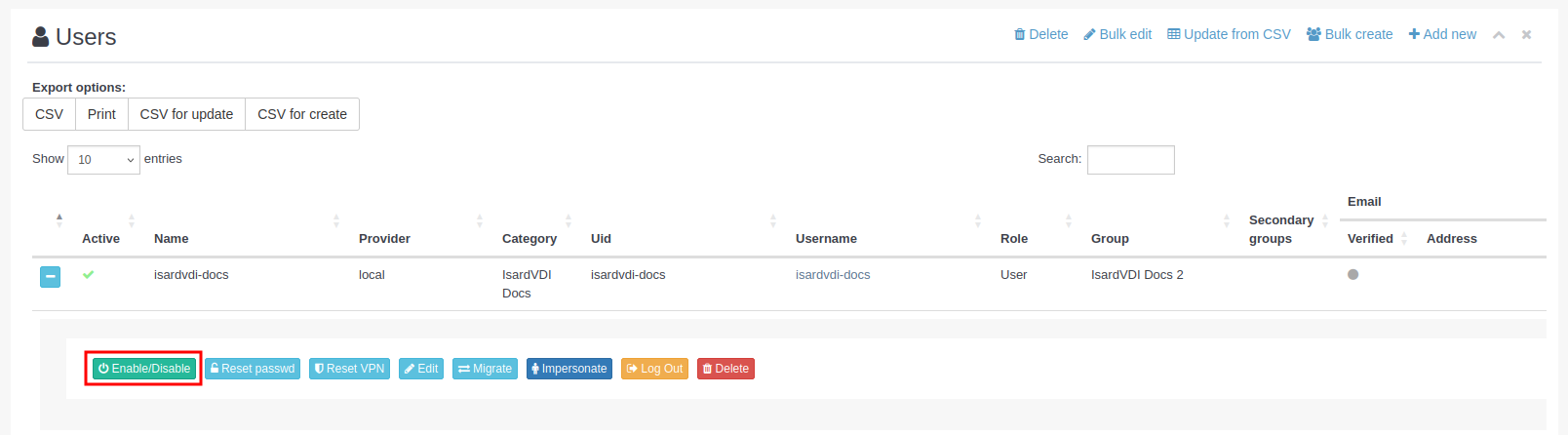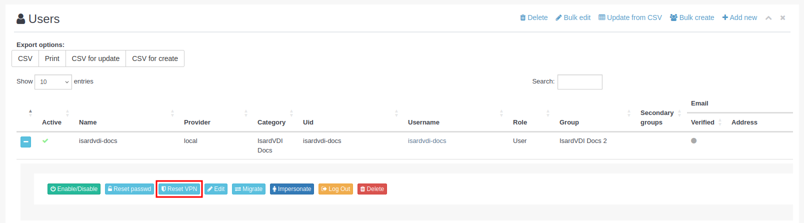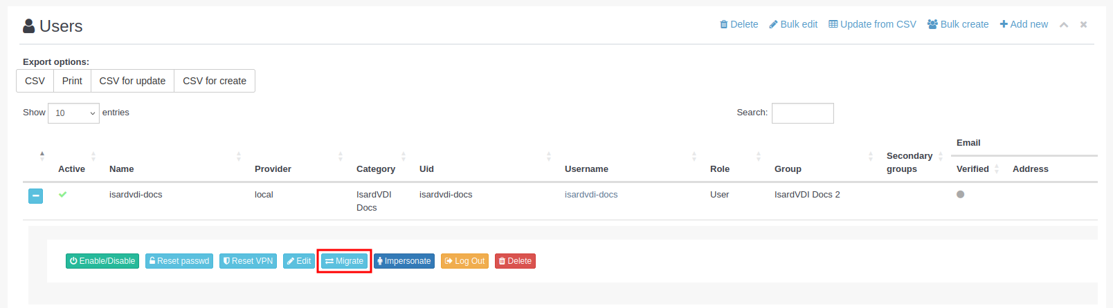 Si lo que se quiere es generar un CSV para crear los usuarios ya existentes como copia de seguridad o recreación en otra instalación, hay que utilizar el botón CSV for create.