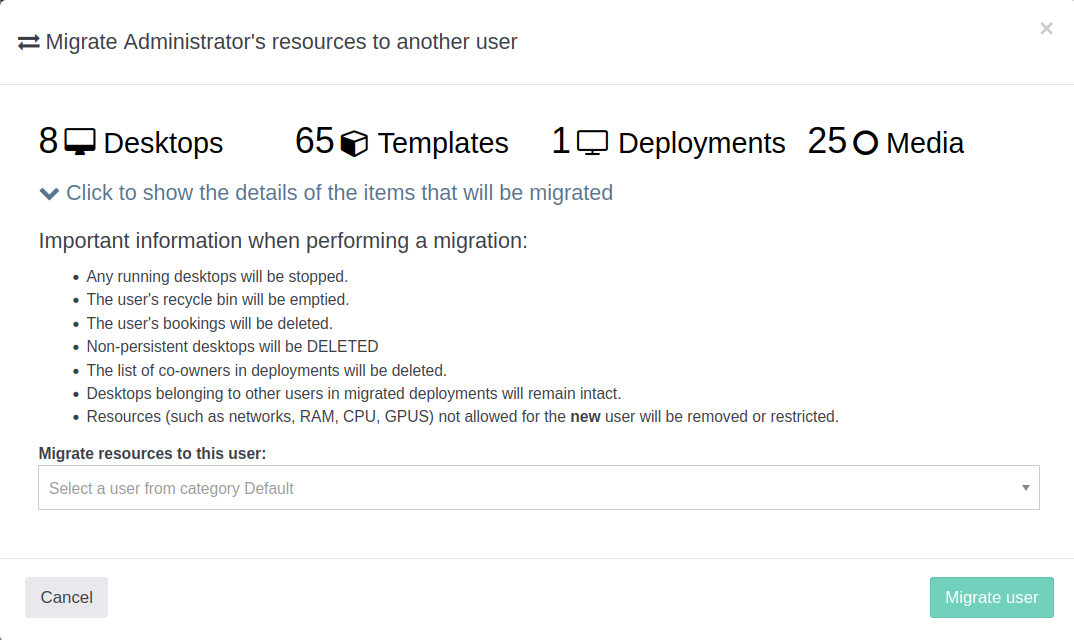 Se abrirá una ventana de diálogo donde se mostrará si el usuario tiene algún ítem creado (escritorio, plantilla, despliegue o medios), junto con una serie de advertencias a la hora de hacer la migración de estos ítems de un usuario a otro.