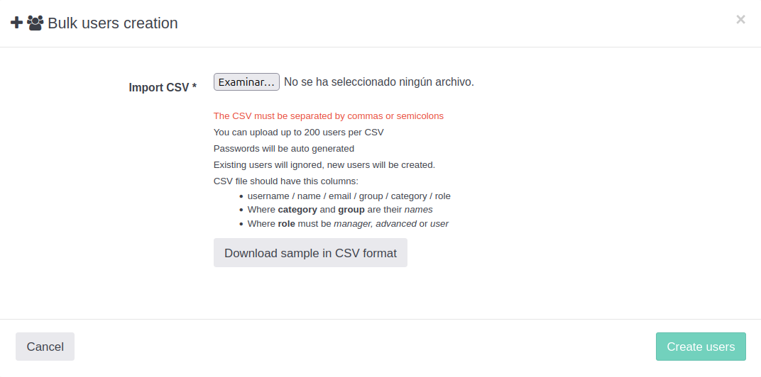 El archivo CSV no incluirá las contraseñas de los usuarios, se generarán al hacer la creación masiva.