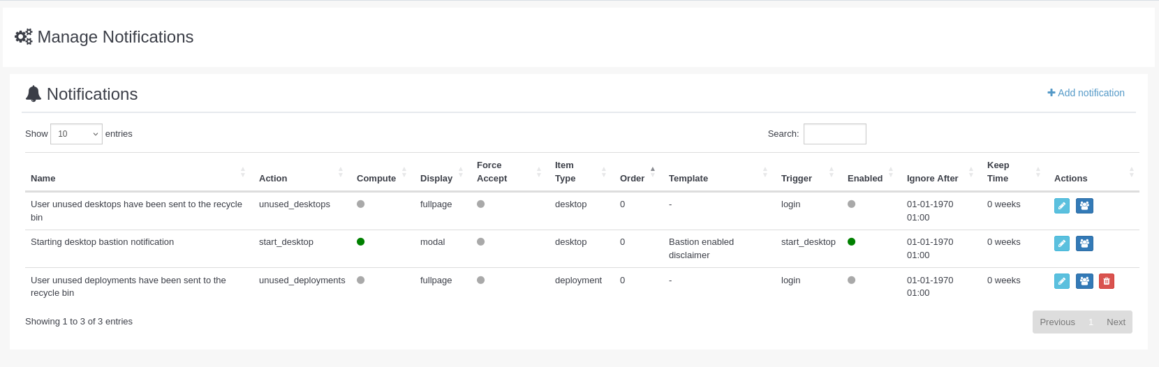 Solo es necesario asociar una plantilla y activar la notificación. Los permisos (allowed) pueden configurarse posteriormente, según cuándo se desee mostrar la notificación.