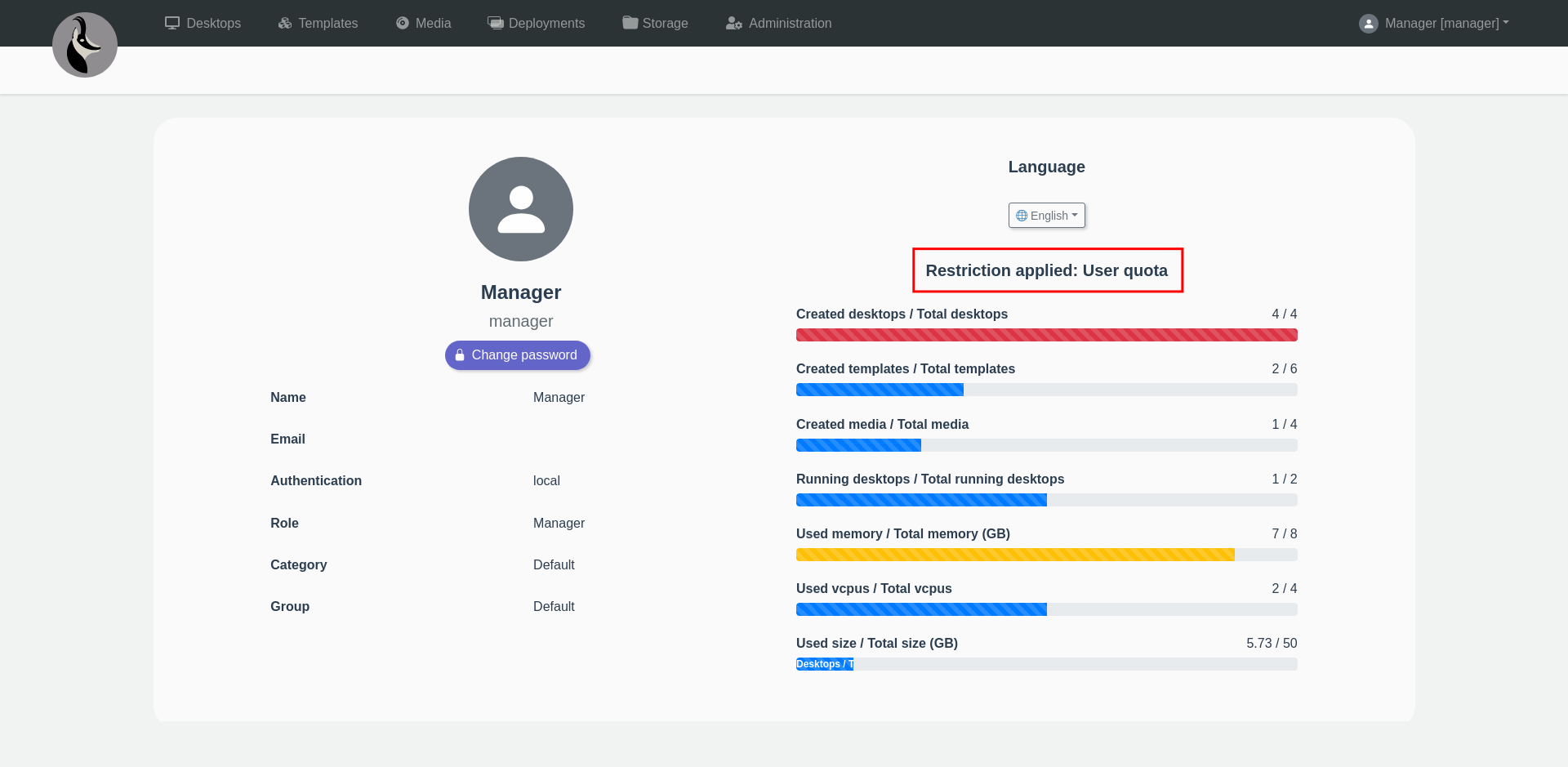 La restricción aplicada (cuota de usuario, grupo o de categoría) y el uso de los recursos se pueden consultar a través de la página de perfil.