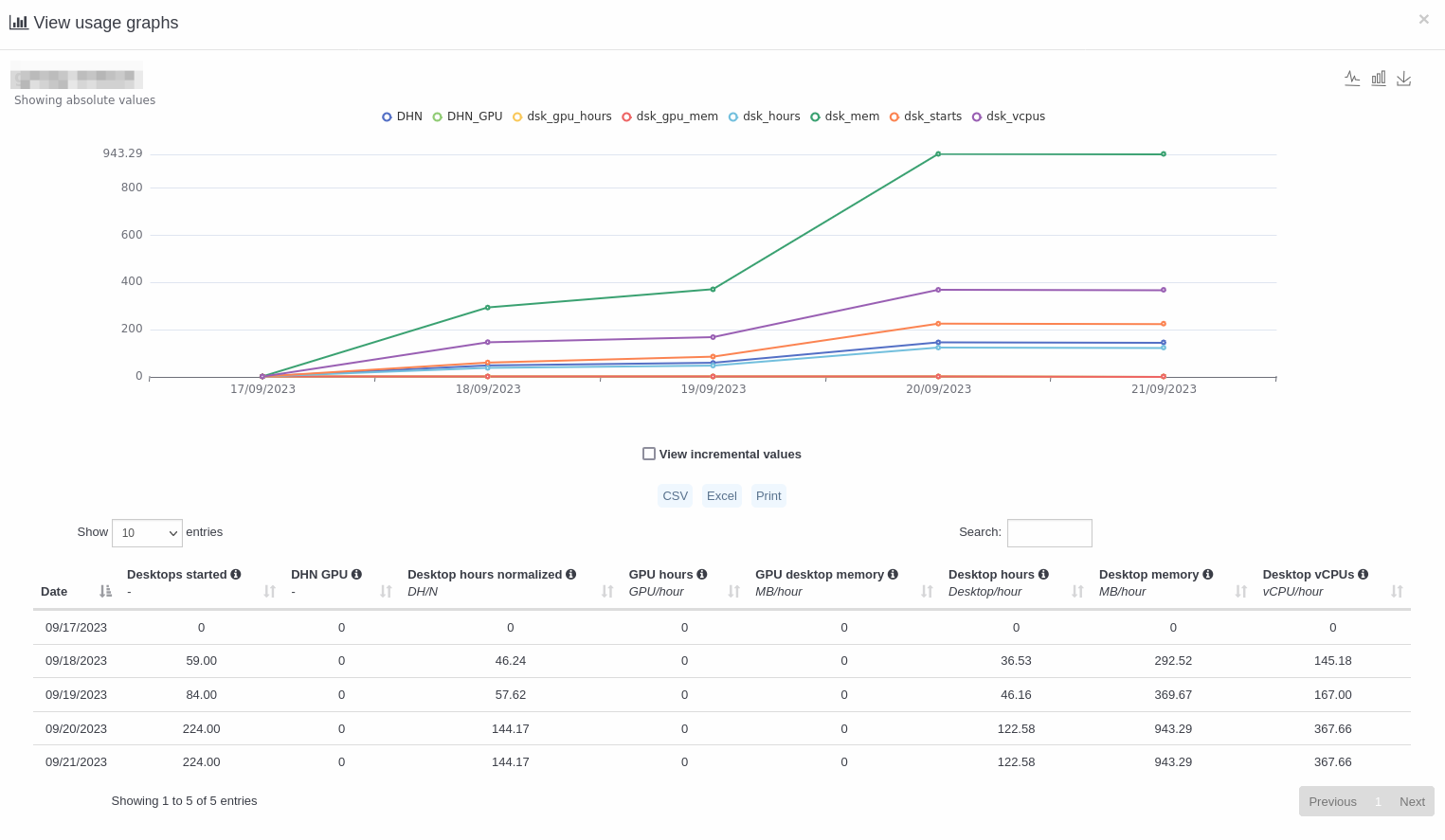 - De un escritorio podemos ver el consumo por categoría, grupo, despliegue, plantilla, usuario e individualmente por cada escritorio.
