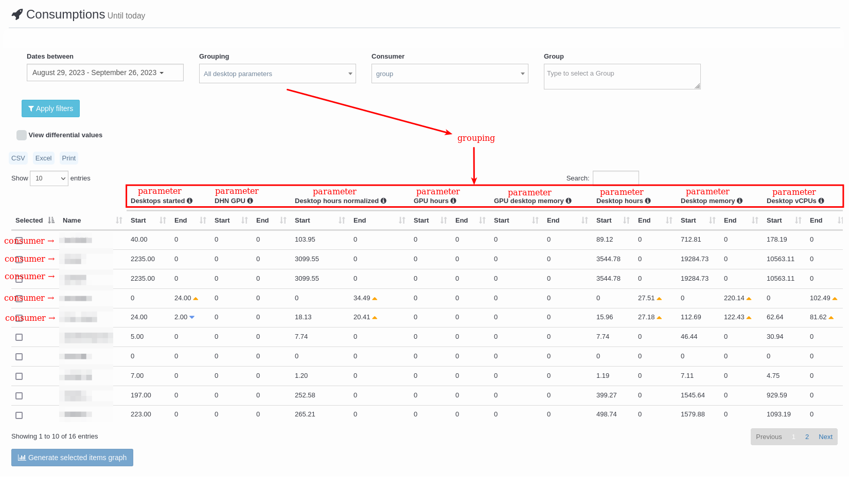 Parameter: Cada uno de los distintos consumos registrados. Por ejemplo, cuántos escritorios han arrancado, cuántas horas han sido arrancados, cuánta memoria han utilizado, cuánto almacenamiento se ha utilizado, etc.