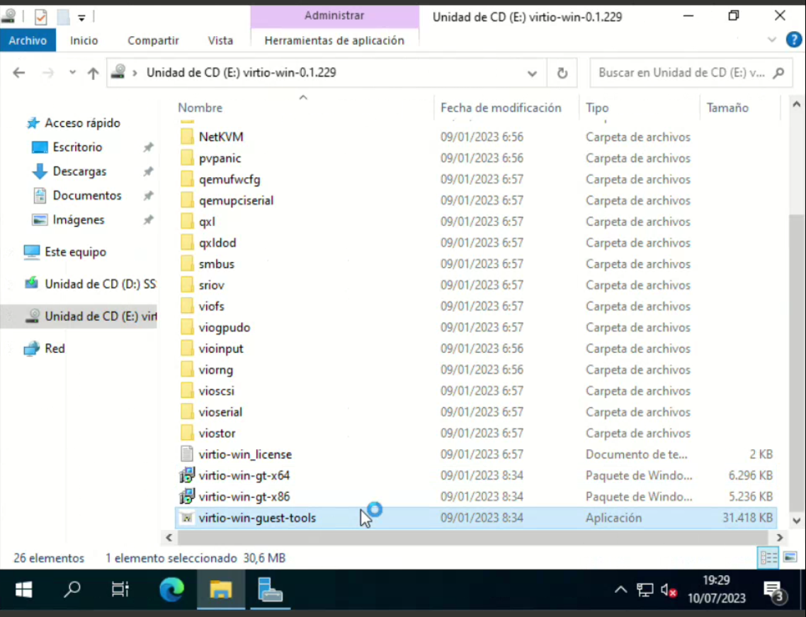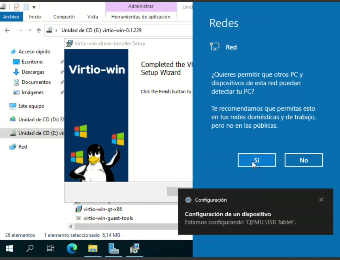 Se instalan los dos drivers Virtio del medio del escritorio. Ambas instalaciones son rápidas y sencillas. Durante el proceso, únicamente deberá ir pulsando el botón "Siguiente" (Next) hasta completar la instalación.