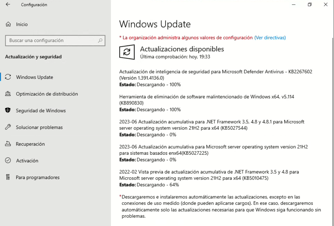 Se comprueban las actualizaciones del sistema, las cuales van a tardar bastante en descargarse e instalarse, para estar al día con la última versión de Windows Server (seguramente se necesite reiniciar el sistema varias veces en busca de nuevas actualizaciones).