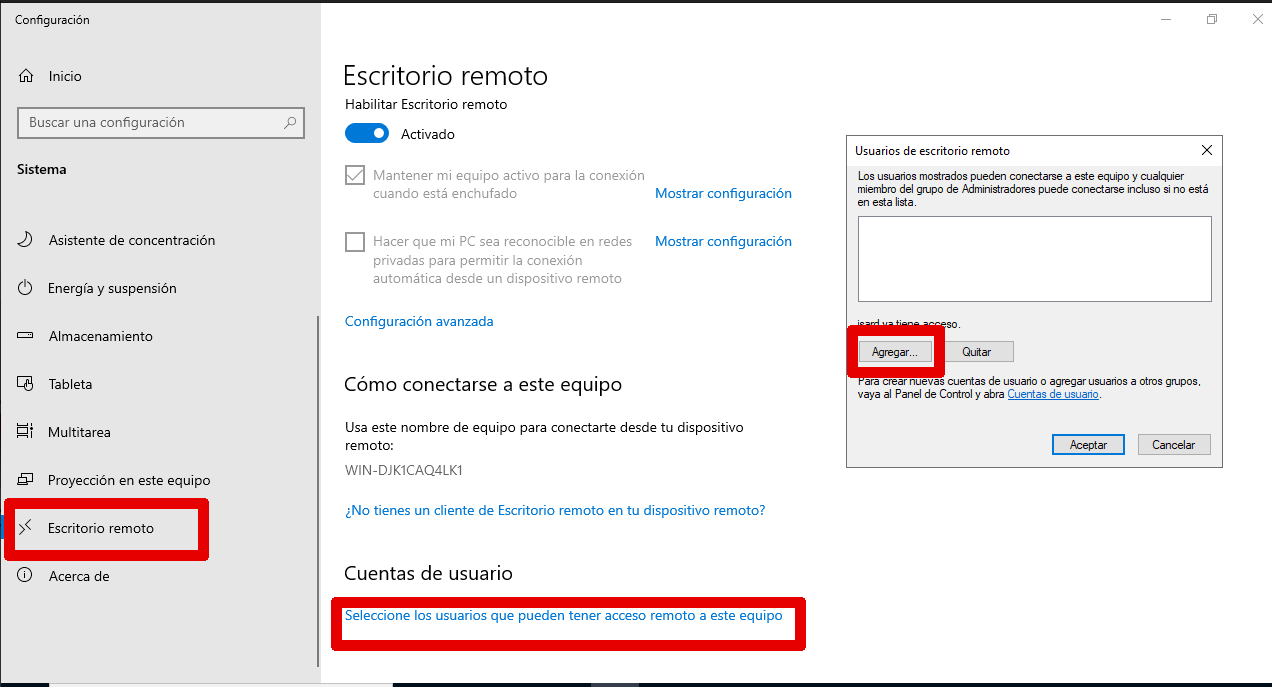 Antes de poder conectarse, deberemos dar permisos a estas cuentas. Por lo tanto, nos iremos a configuración > escritorio remoto > cuentas de usuario > agregar.