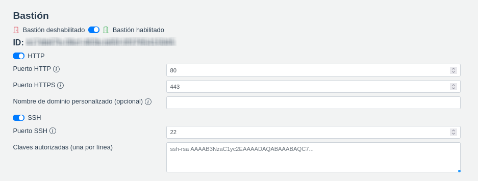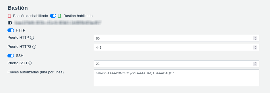 Para poder acceder, es necesario añadir la clave pública del dispositivo desde el que se quiere conectar en el apartado de claves autorizadas en la edición de Bastión.