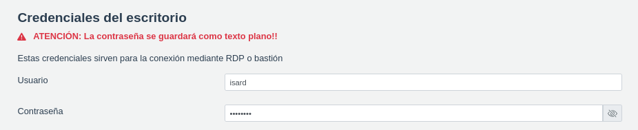 Continuando dentro del apartado de edición de la máquina virtual, en la sección Credenciales del escritorio, se encuentran las credenciales necesarias para acceder remotamente al escritorio virtual a través del servicio SSH. Estas credenciales sirven para la conexión tanto por RDP como para Bastión.