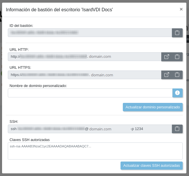 - Nombre de dominio personalizado: Esta opción permite asignar un nombre propio al servidor web (al escritorio virtual) en lugar de utilizar el UUID del escritorio como dominio.