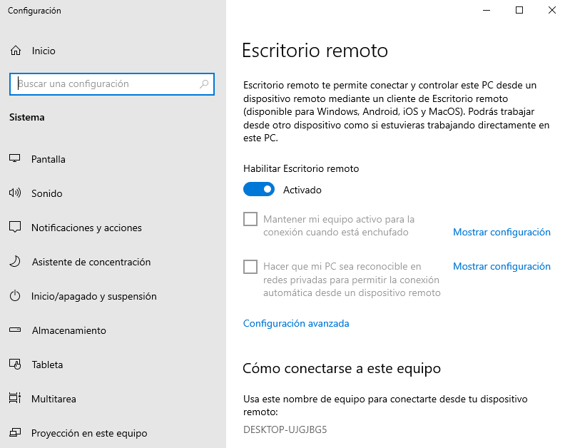 Así como debe estar activado en el equipo anfitrión, como se ha explicado anteriormente en este manual, el protocolo RDP debe estar activado también dentro del sistema operativo de los propios escritorios virtuales.