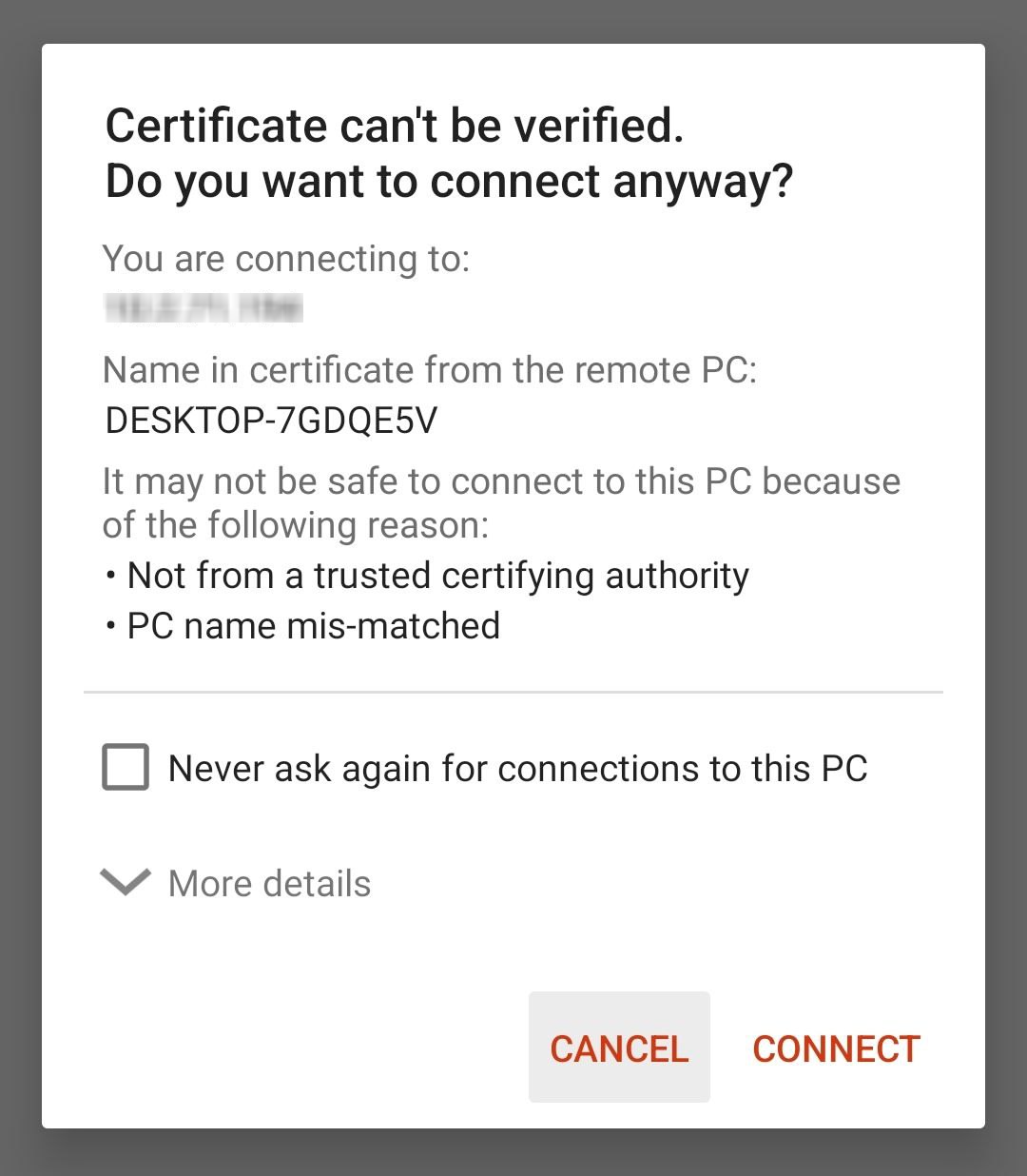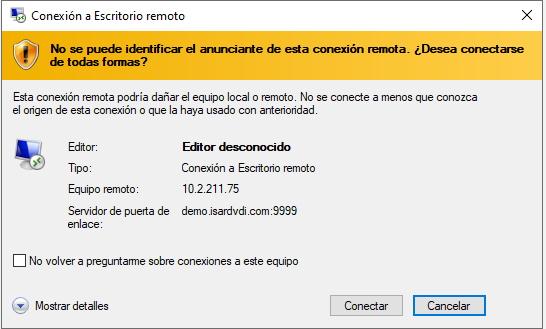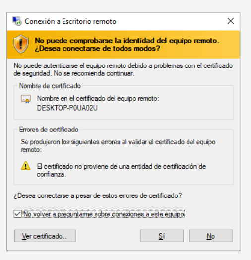 La primera vez que se realiza la conexión RDP en el anfitrión, éste informa con una alerta de seguridad, la cual se puede evitar marcando la casilla "No volver a preguntarme sobre conexiones a este equipo" para el futuro.