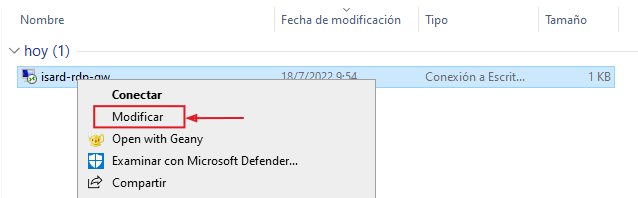 Del fichero .rdp que se descargue al seleccionar Visor RDP o Visor RDP VPN de un escritorio arrancado, se modifica con el botón derecho en la ruta donde se halle.