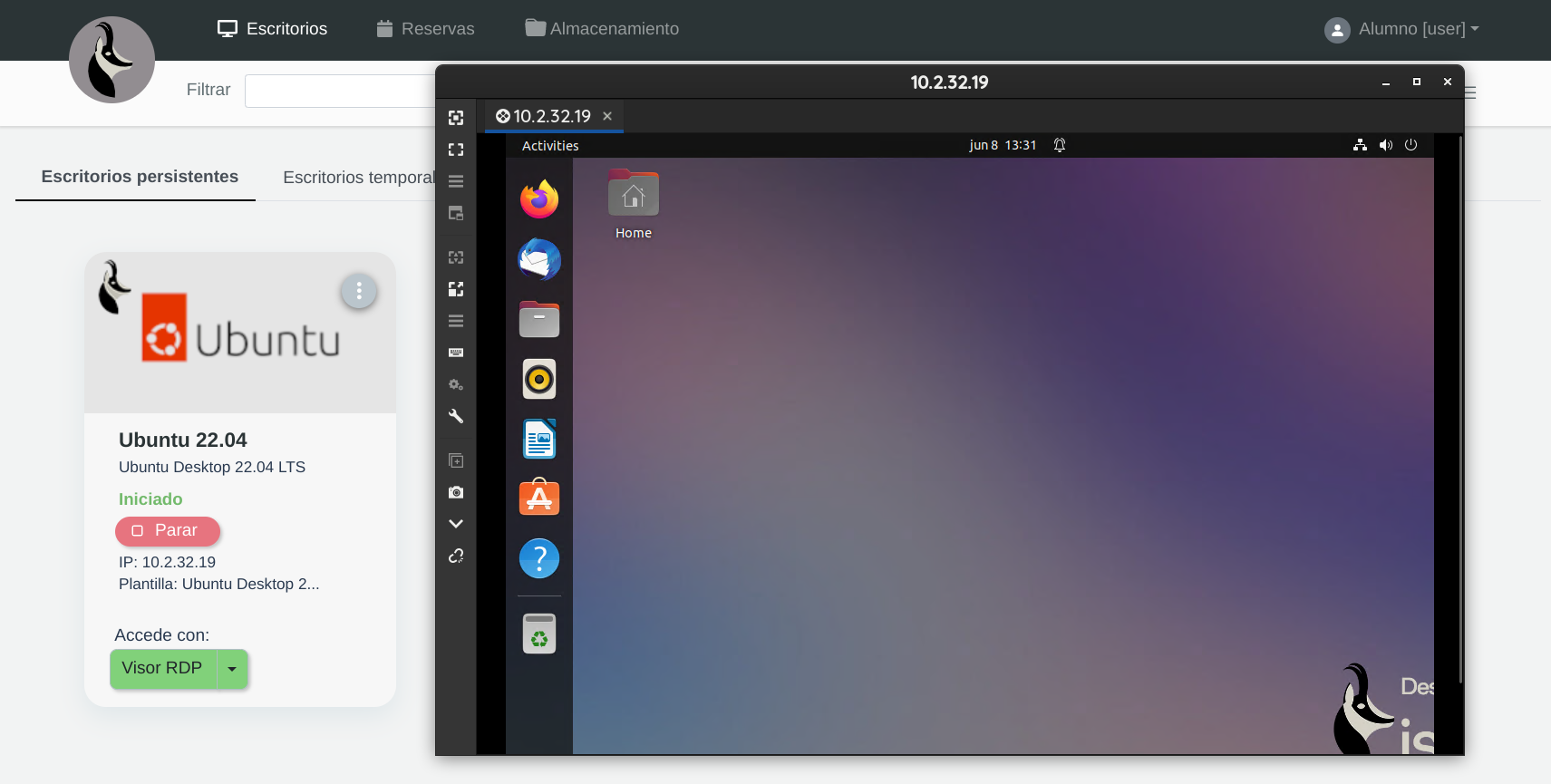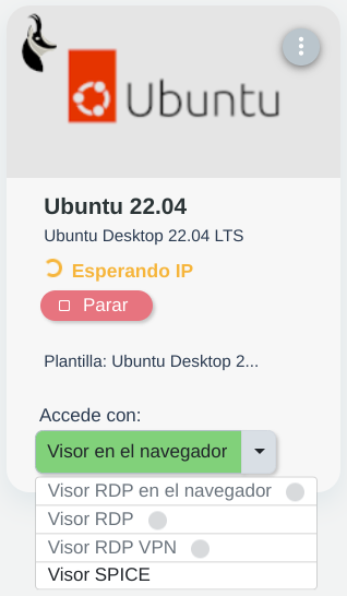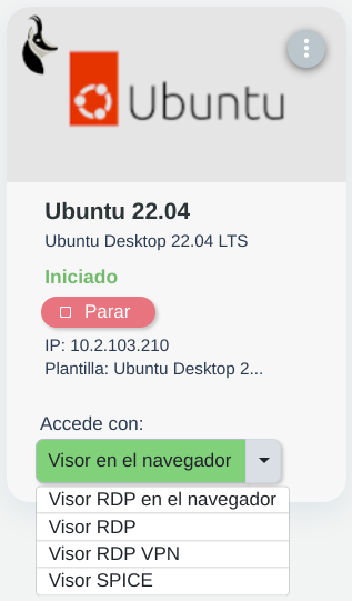 Una vez éste ha obtenido dirección IP, se le informa de ella al usuario mediante la interfaz y se activa el acceso a los visores RDP, RDP en el navegador y RDP VPN: