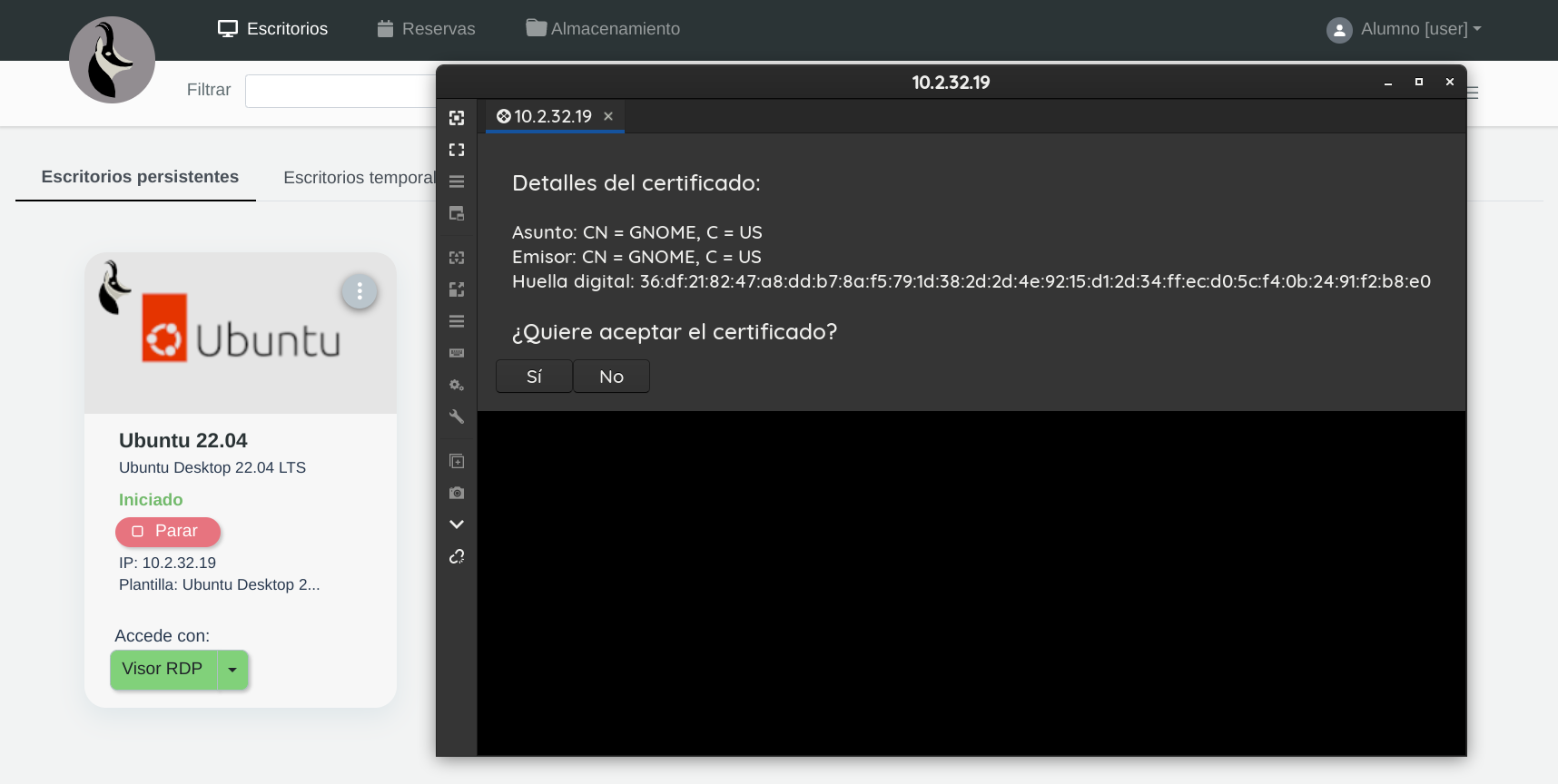 Al acceder al escritorio nos pide confirmación para aceptar el certificado: