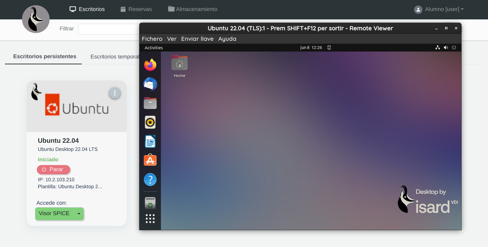 Después de realizar la descarga del software necesario, en el arranque de un escritorio, se selecciona Visor SPICE y se abre el archivo descargado. Una vez abierto se podrá acceder al escritorio.