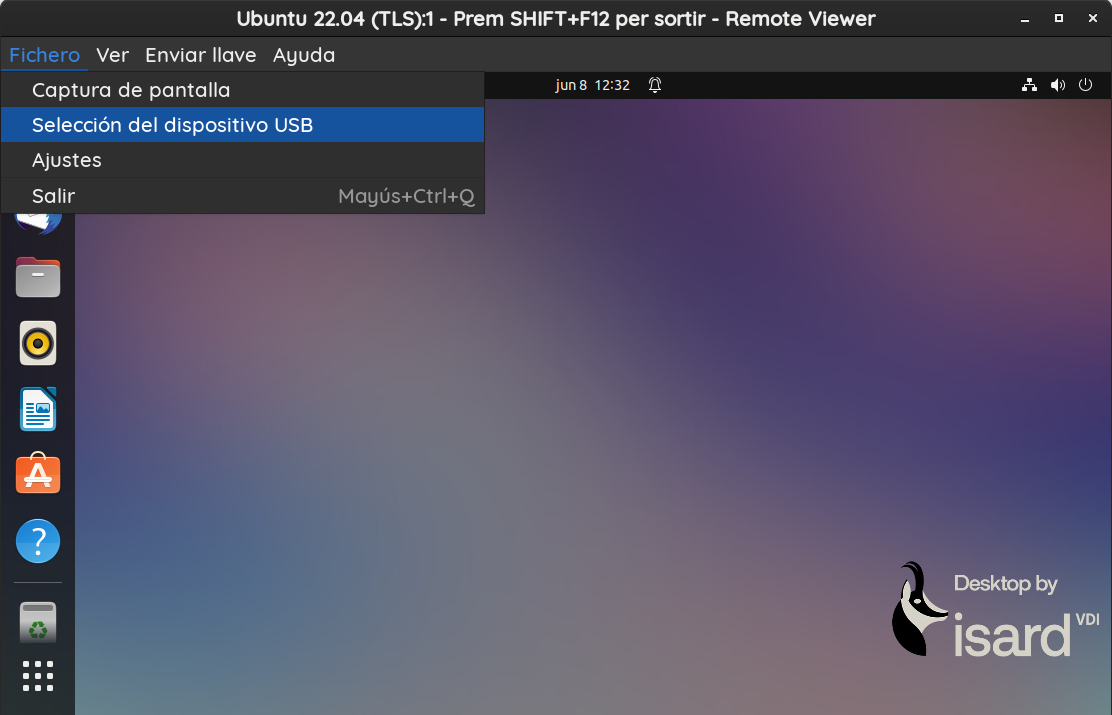 Se abre el visor SPICE del escritorio y se seleccionan las opciones Fichero >> Selección del dispositivo USB y el dispositivo a escanear.
