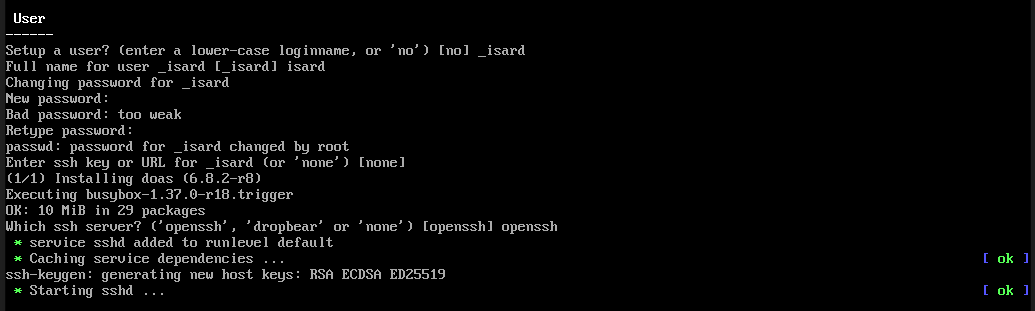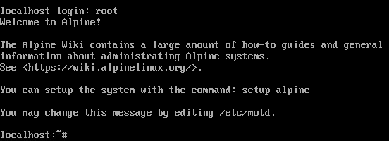 To start the installation, run setup-alpine and follow the steps of the assistant to configure network, timezone, etc.