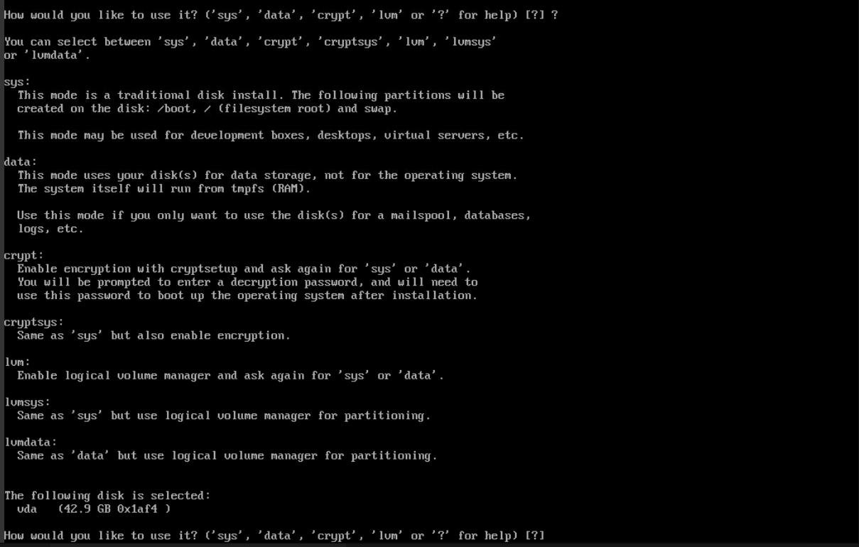- Choose the one that appears, typing its name ('vda'). Then it asks how you want to use the selected disk.