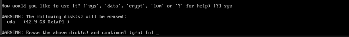 - Type the option 'sys', and a confirmation question will appear to erase the disk content and partition, to mount the two partitions.