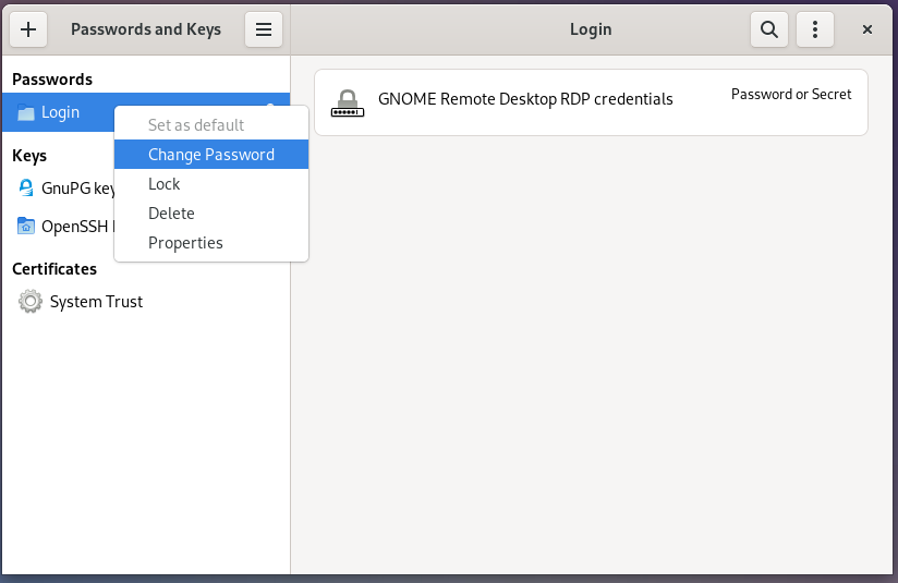 Passwords and keys - Passwords - Login - Change password