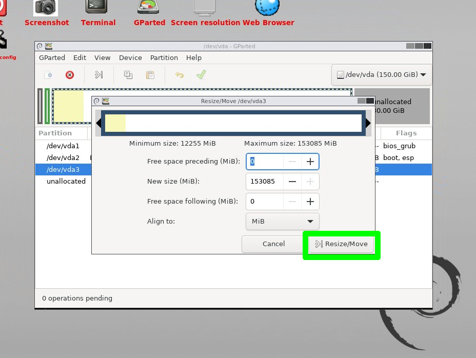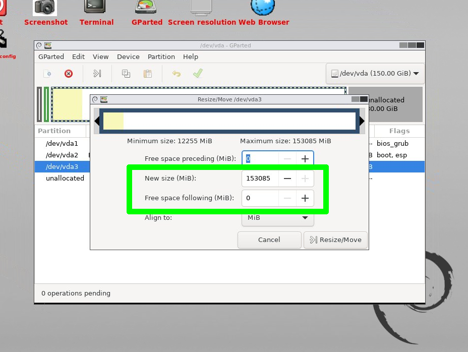 Free space following (MiB): Here we can see the free space that we have to the right of this partition.
