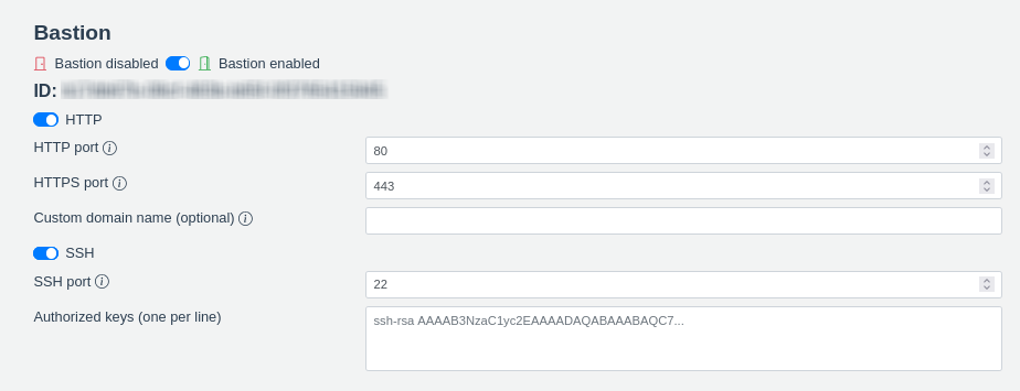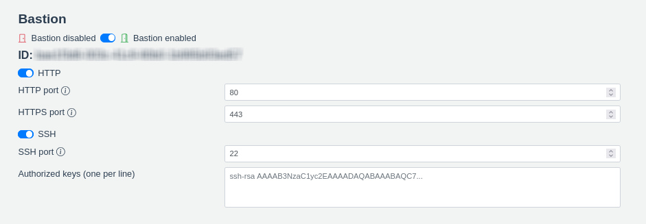 To gain access, the public key of the device used to connect must be added in the authorized keys section in the Bastion editor.