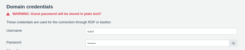 Continuing within the virtual machine editing section, in the Domain credentials section, you will find the credentials needed to remotely access the virtual desktop via SSH. These credentials work for both RDP and Bastion connections.