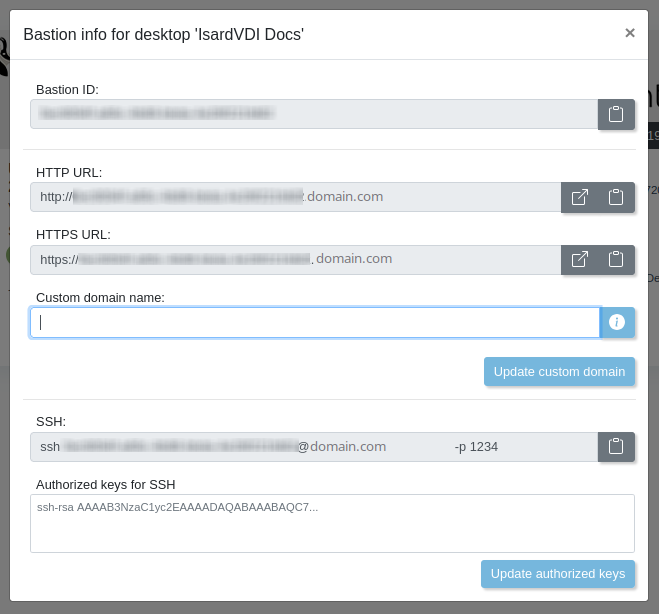 - Custom domain name: This option allows assigning a custom name to the web server (the virtual desktop) instead of using the desktop UUID as the domain.