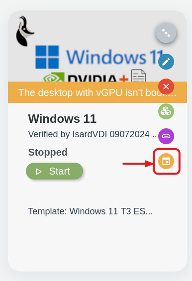 To book a GPU for the desktop, access it through the last action icon on the desktop card.