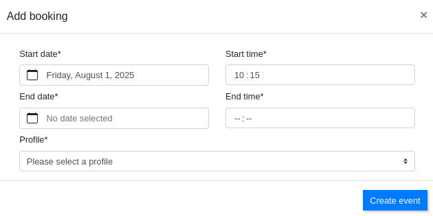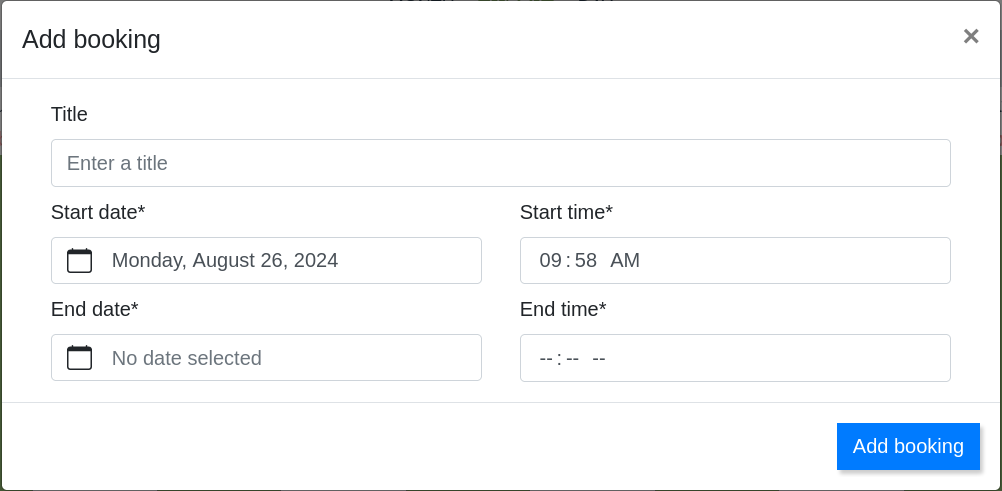 or by clicking and dragging on the bookings column to select the desired time range. In the form that appears, we can adjust the date and time range for the booking we want to make.
