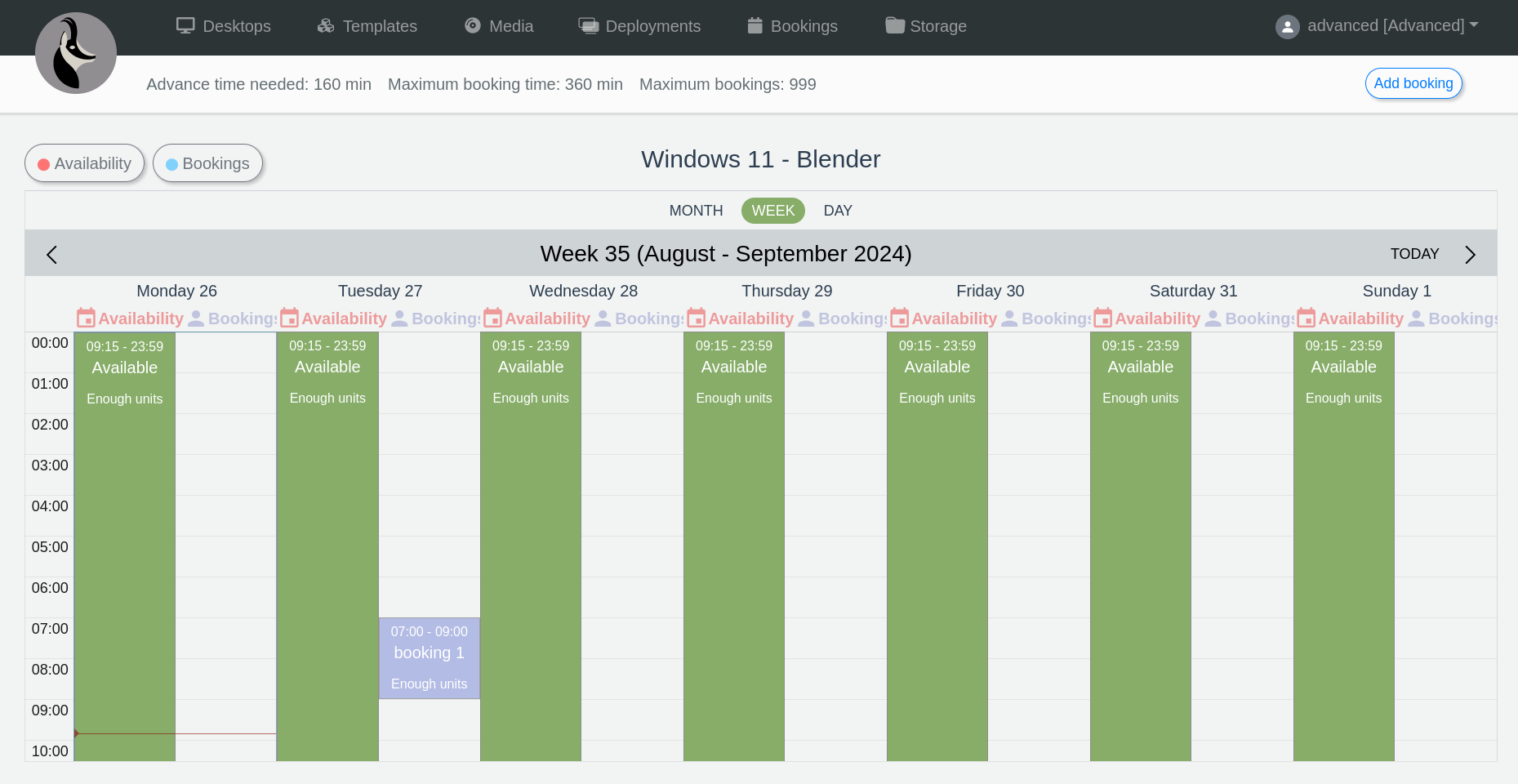 This gives us access to the weekly availability view (we can change the view to monthly or daily), where we find two columns for each day of the week. In the left column, the availability for the card profile is displayed, and in the right column, the bookings we have for that desktop or deployment are displayed.