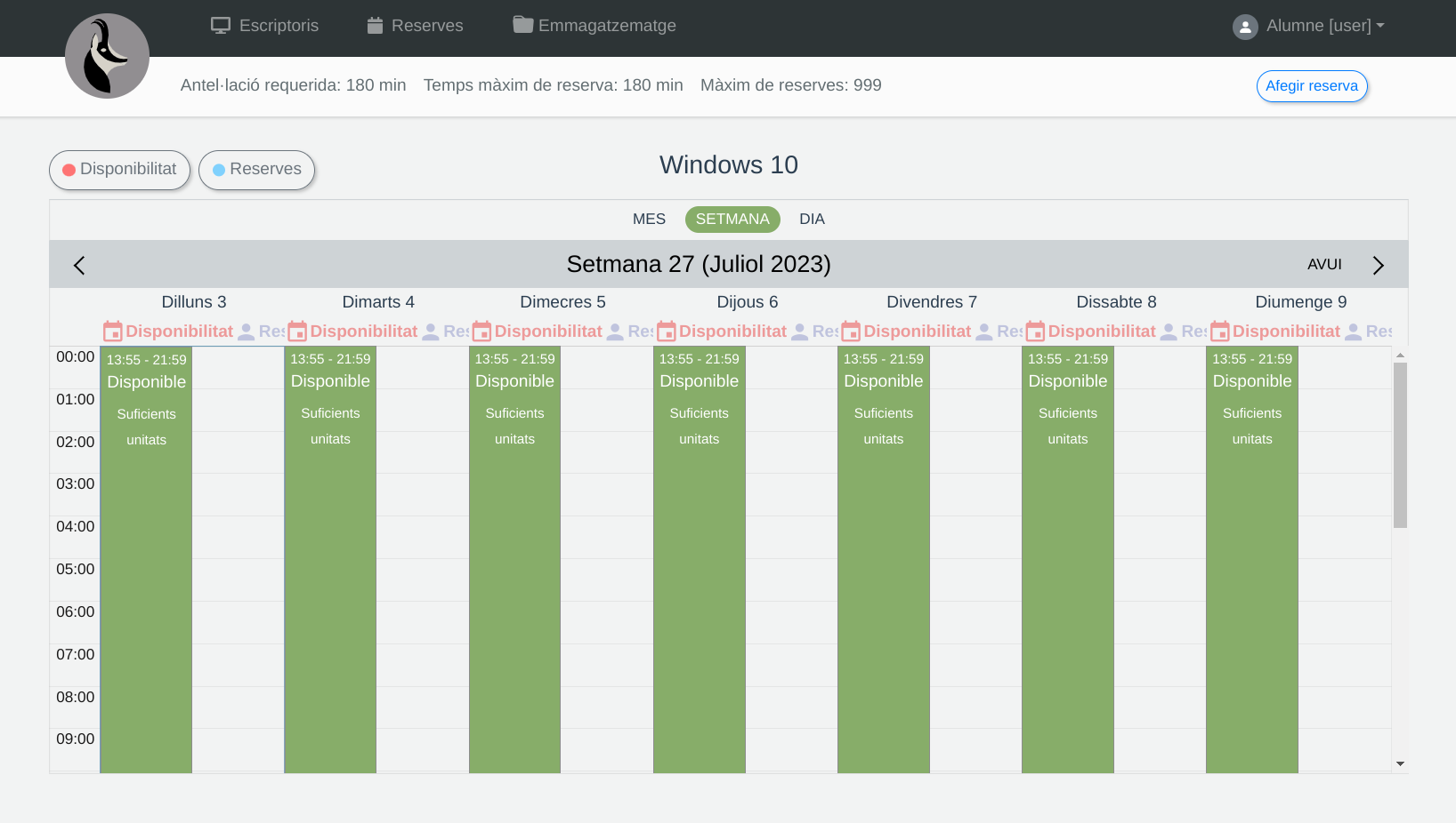 The screenshot shows there is availability during the week and no reservations have been made.
