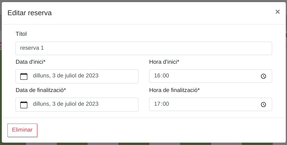 or by clicking and dragging on the reservation stripe to select the desired time range. In the form that appears, adjust the date/time range of the reservation.