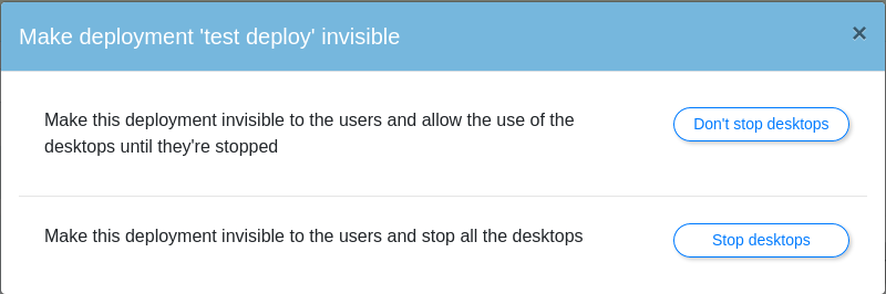 Don't stop desktops: This option will make the deployment invisible to the user. However, if a user is currently using their desktop at the time it's made invisible, they will still be able to use it until they decide it's stopped. Once it's stopped, the user won't be able to access it again until the deployment is made visible again.