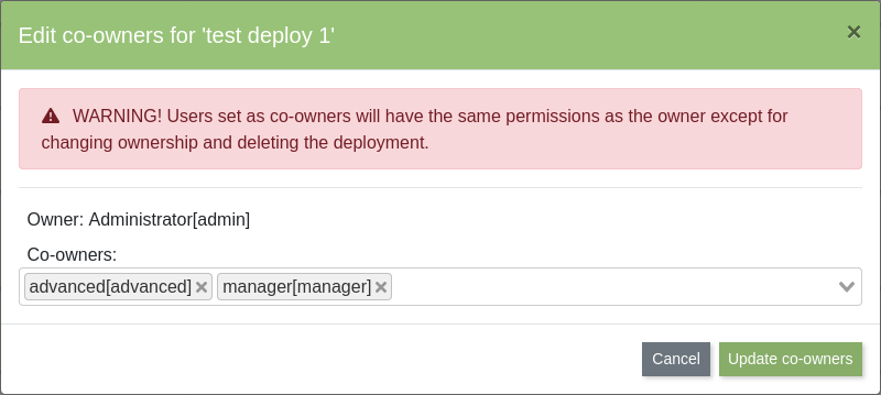 Users set as co-owners will have the same permissions as the owner of the deployment. They will be able to start and stop desktops, view the desktops, and access the deployment settings. They will not be able to delete the deployment or change the owner and co-owners.