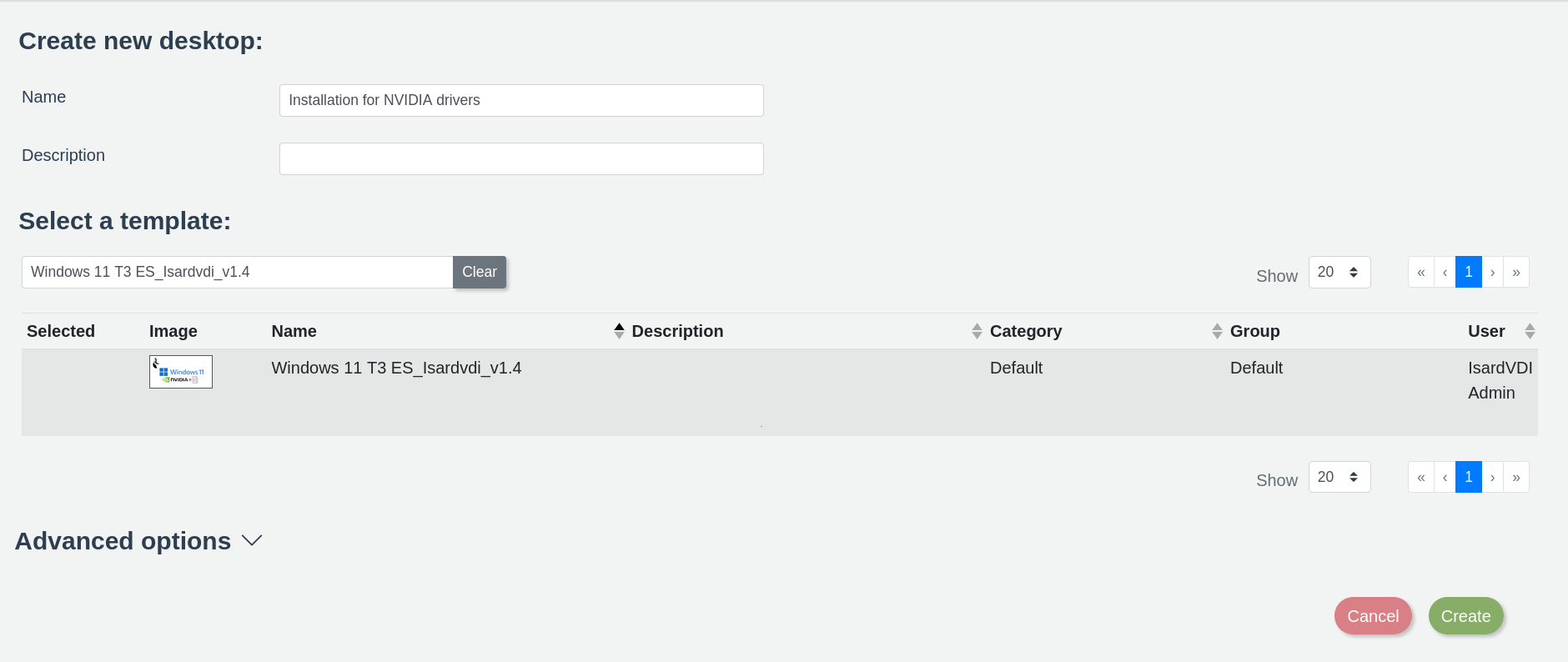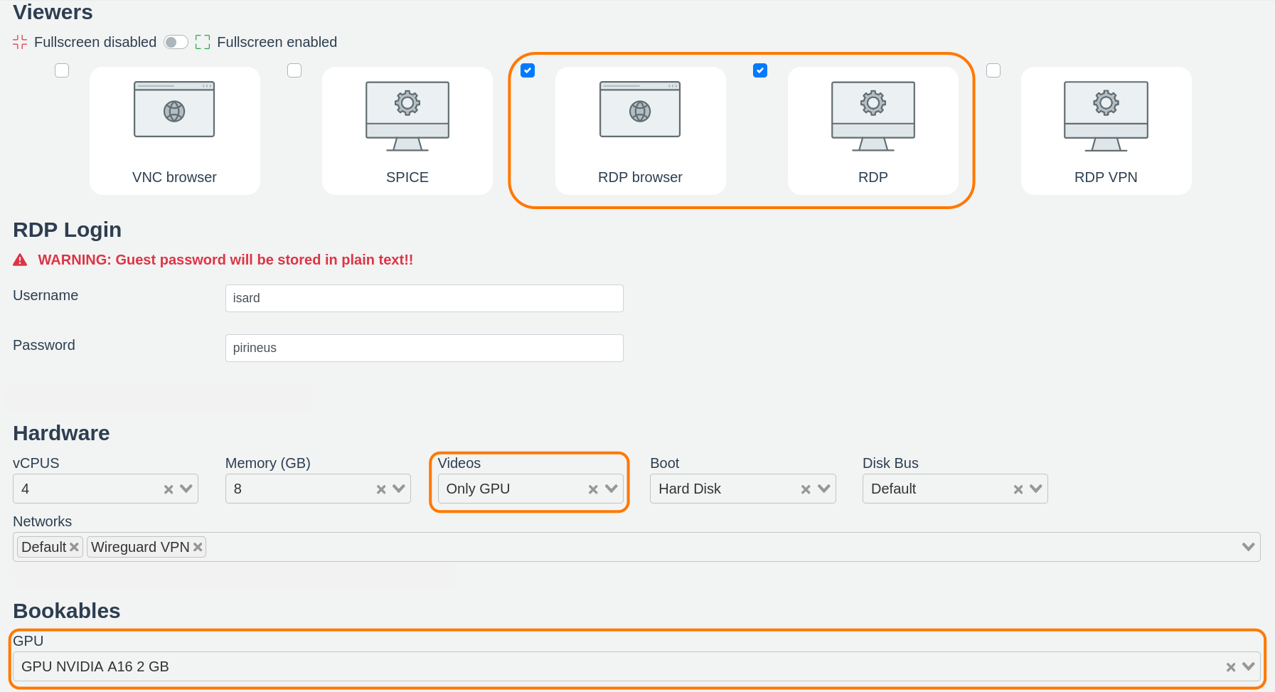 Without messing with the desktop and without starting it, edit it from IsardVDI to change the parameters so that it looks like the image below. It is very important to disable the previous viewers and leave only RDP (Client) and RDP (Browser); The Video parameter must have the Only GPU option selected: