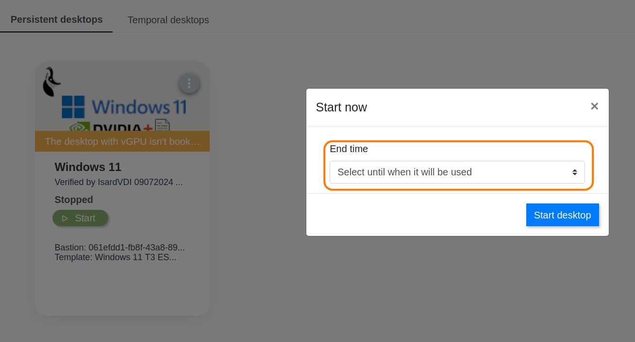 There are two ways to start the desktop with GPU: the first is to use the "start now" function, which starts the desktop immediately if GPU profiles are available. The second option is through a reservation, which requires booking the desktop in advance defined by the IsardVDI administrator.