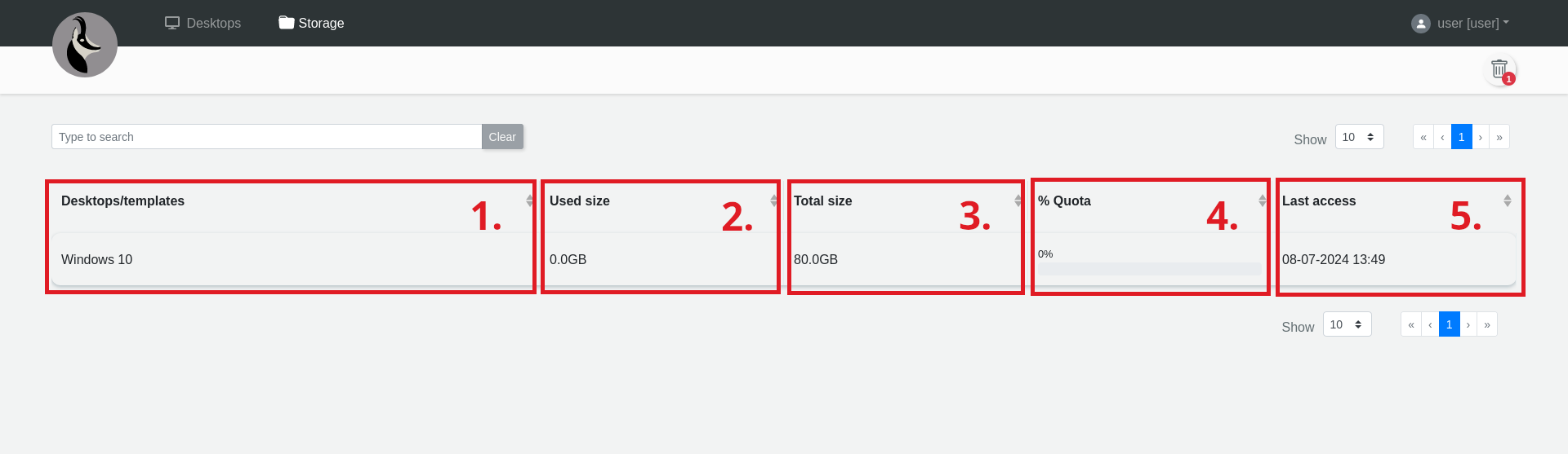 - Desktops/templates: The name given to the desktop/template. If you hover over the name, you will see the storage ID.
