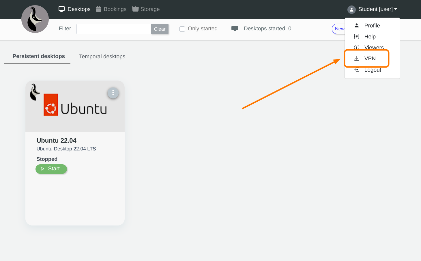 The user establishes a VPN tunnel in IsardVDI to access their desktops using the RDP VPN viewer or simply to establish communication between the host machine and user desktops (e.g., accessing them via an SSH connection).