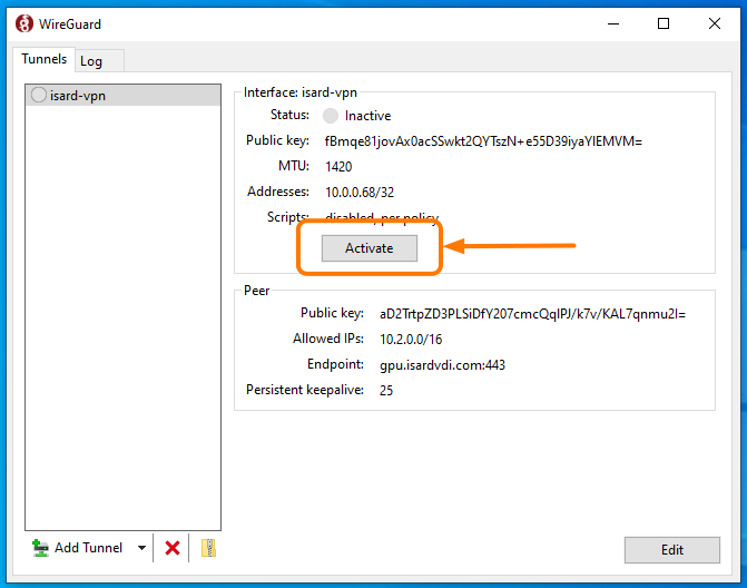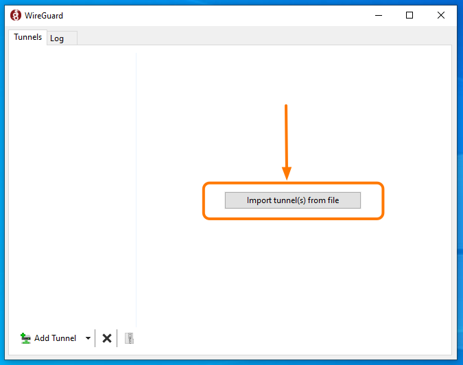 Download WireGuard for Windows using this link, open the program, and import the recently downloaded VPN .conf file.